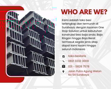 Toko Besi Laris Surabaya merupakan Toko Besi Surabaya terpercaya dan terlengkap dengan harga bersaing. Dengan berbagai macam pilihan dan variasi barang yang kami miliki, kami siap menyesuaikan dengan kebutuhan project anda. Dengan One Stop Solution Service serta pengiriman ke seluruh Indonesia, kami pastikan segala kebutuhan besi dan baja anda dapat kami layani dengan cepat, tepat, dan profesional.